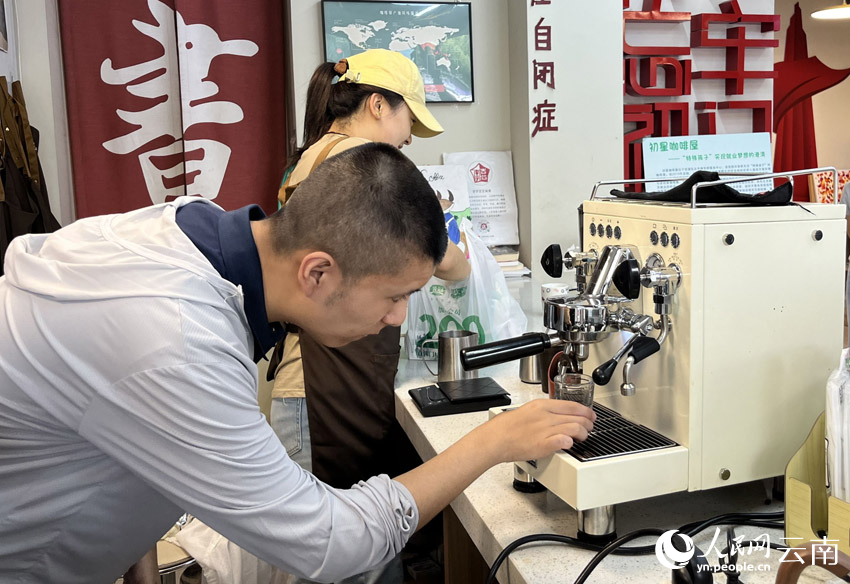 Duoduo is a 23-year-old barista with autism at Chuxing Cafe in Hepinglu neighborhood, Taihe subdistrict, Guandu district, Kunming. It took him two years to master the skills of making coffee.