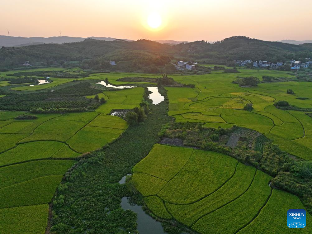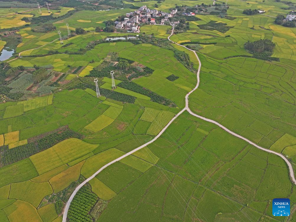 An aerial drone photo taken on Oct. 10, 2024 shows fields in Sicun Town of Xiangzhou County in Laibin City, south China's Guangxi Zhuang Autonomous Region. As a key grain production base in Guangxi, Xiangzhou County's grain sown area reached over 460,000 mu (about 30,667 hectares) in 2024, and the grain output is expected to surpass 160,000 tonnes. (Xinhua/Zhou Hua)