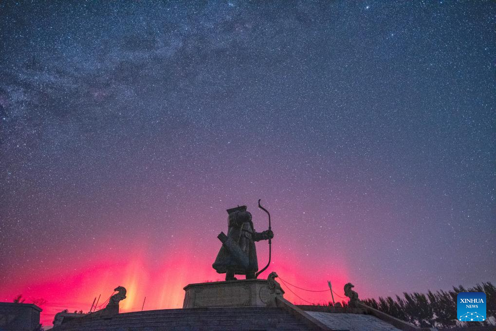 This photo taken on Oct. 11, 2024 shows the northern lights over a scenic area in Daqing City, northeast China's Heilongjiang Province. Northern lights were observed at different places across Heilongjiang in the early morning on Friday. (Photo by Liu Wei/Xinhua)