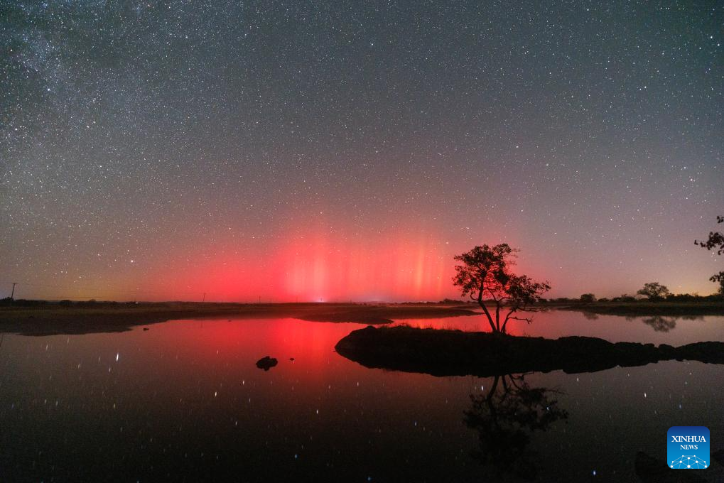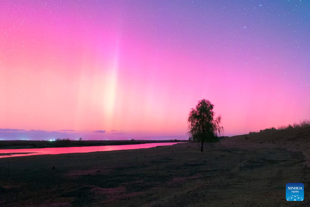 This photo taken on Oct. 11, 2024 shows the northern lights over a wetland in Harbin City, northeast China's Heilongjiang Province. Northern lights were observed at different places across Heilongjiang in the early morning on Friday. (Photo by Liu Dapeng/Xinhua)