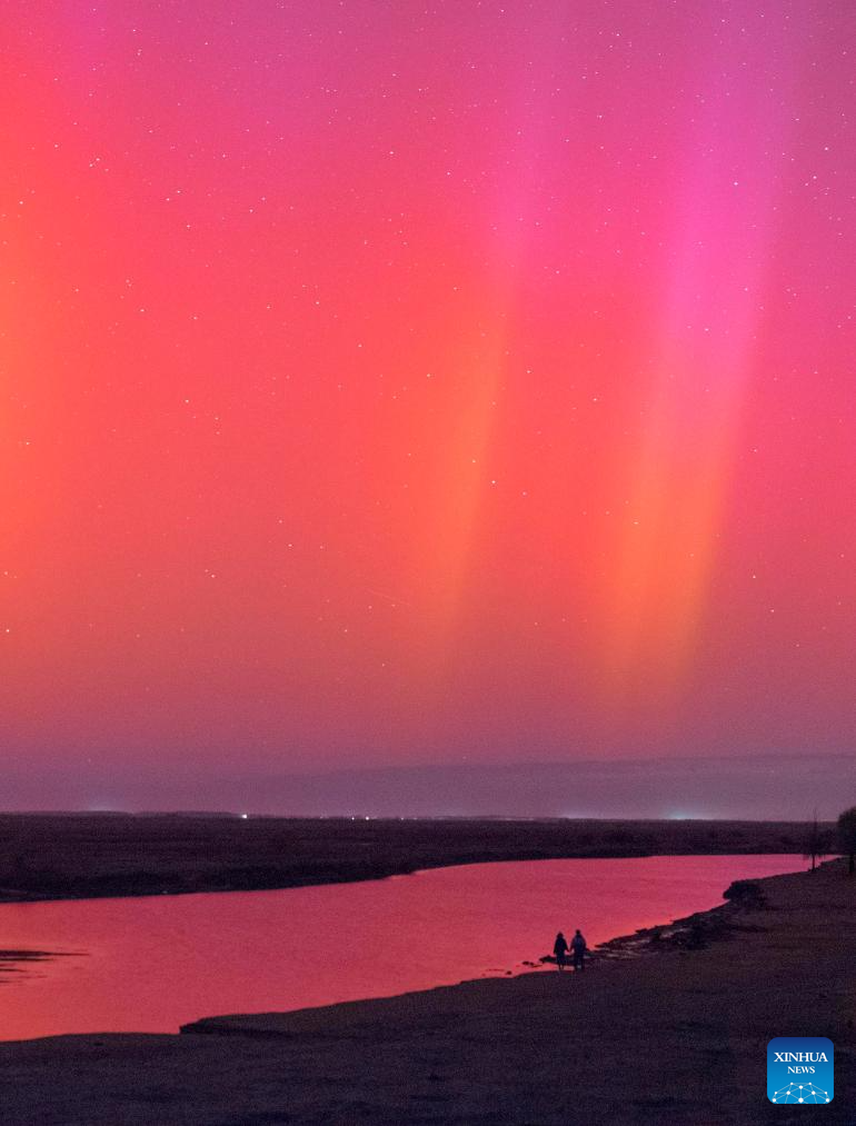 This photo taken on Oct. 11, 2024 shows the northern lights over Mudanjiang City, northeast China's Heilongjiang Province. Northern lights were observed at different places across Heilongjiang in the early morning on Friday. (Photo by Wang Baoxun/Xinhua)