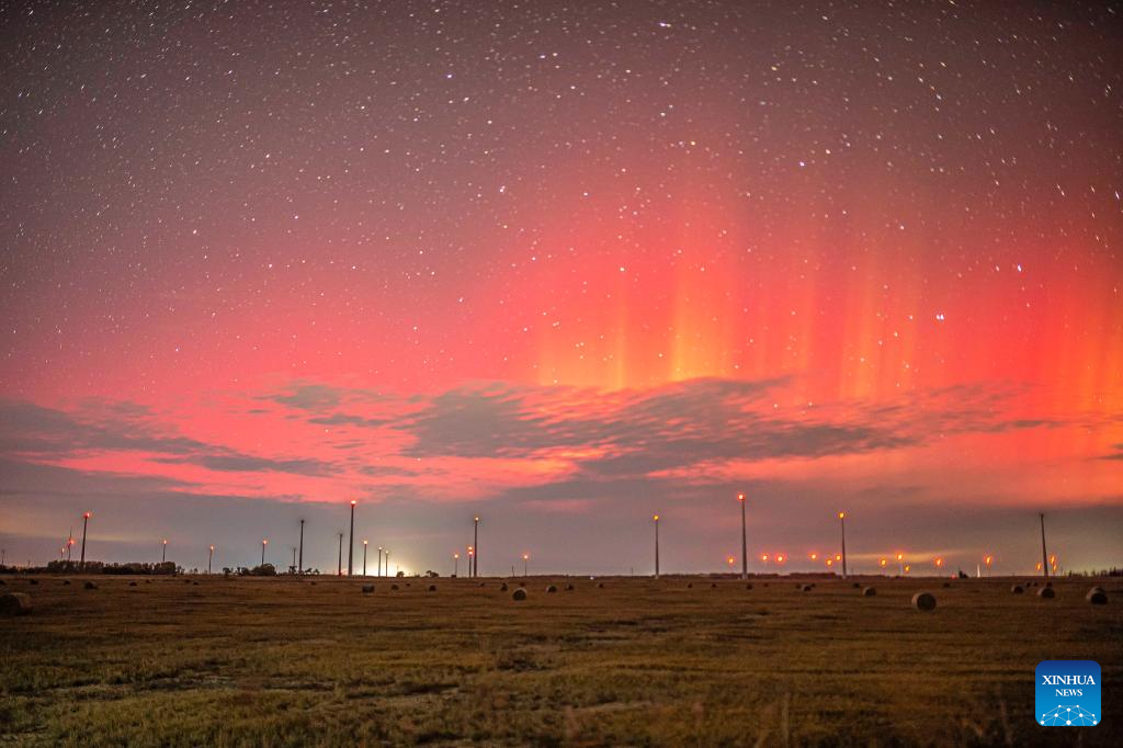 This photo taken on Oct. 11, 2024 shows the northern lights over Fujin City, northeast China's Heilongjiang Province. Northern lights were observed at different places across Heilongjiang in the early morning on Friday. (Photo by Li Xin/Xinhua)