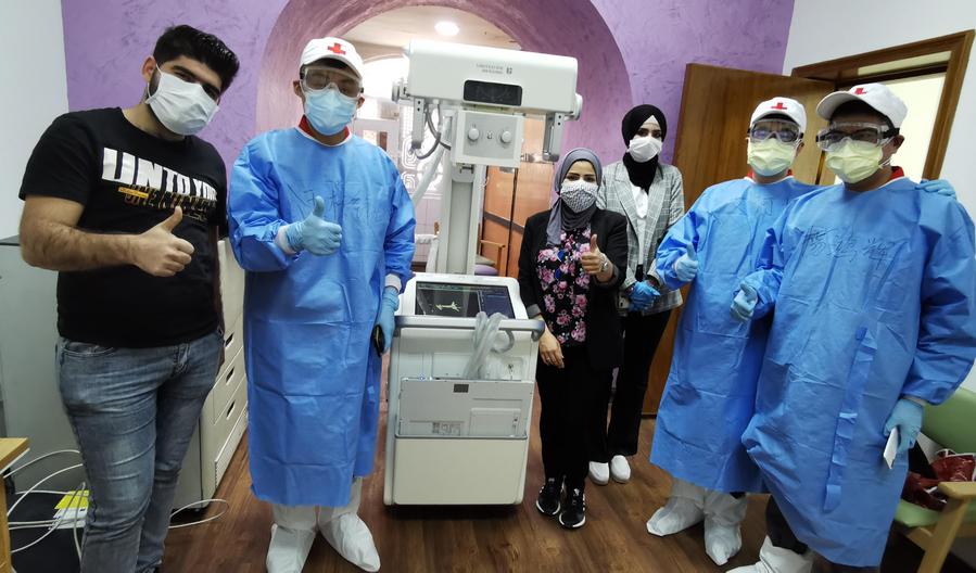 Cellphone photo taken on March 19, 2020 shows experts from Shanghai-based United Imaging Healthcare Co., Ltd. posing for photo with local medical workers after installing a transportable CT scanner in Baghdad, Iraq. (Xinhua)