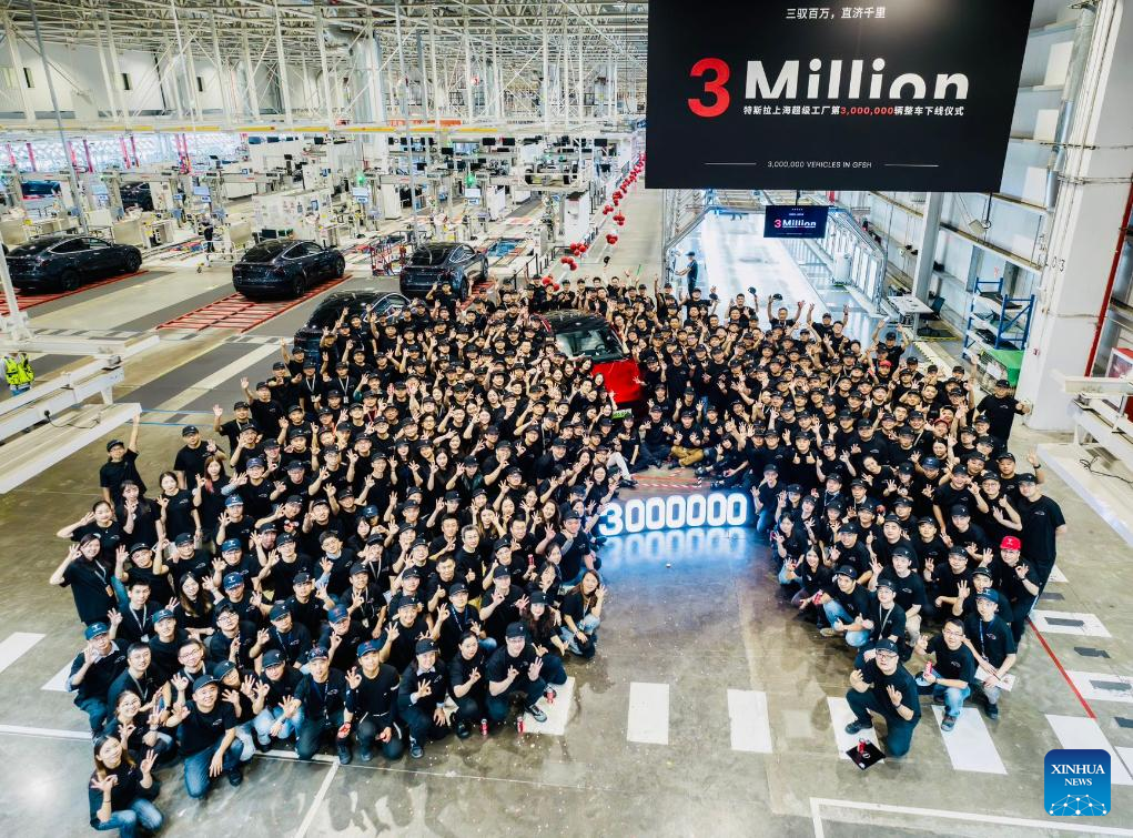 SHANGHAI, Oct. 11 (Xinhua) -- The 3 millionth vehicle produced by Tesla Gigafactory Shanghai rolled off the assembly line on Friday, reaching a new milestone amid the U.S. company's commitment to developing along with China's new energy sector.