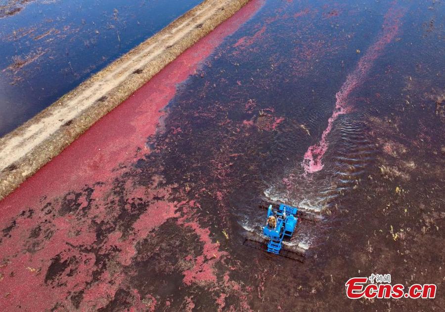 A harvester works at a cranberry field in Fuyuan, northeast China's Heilongjiang Province, Oct. 11, 2024. (Photo: China News Service/Mao Jianjun)