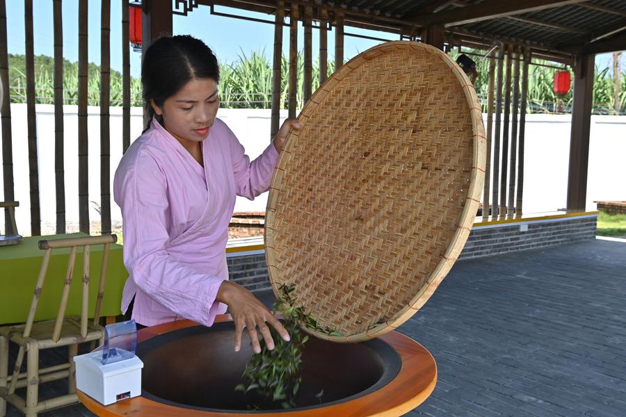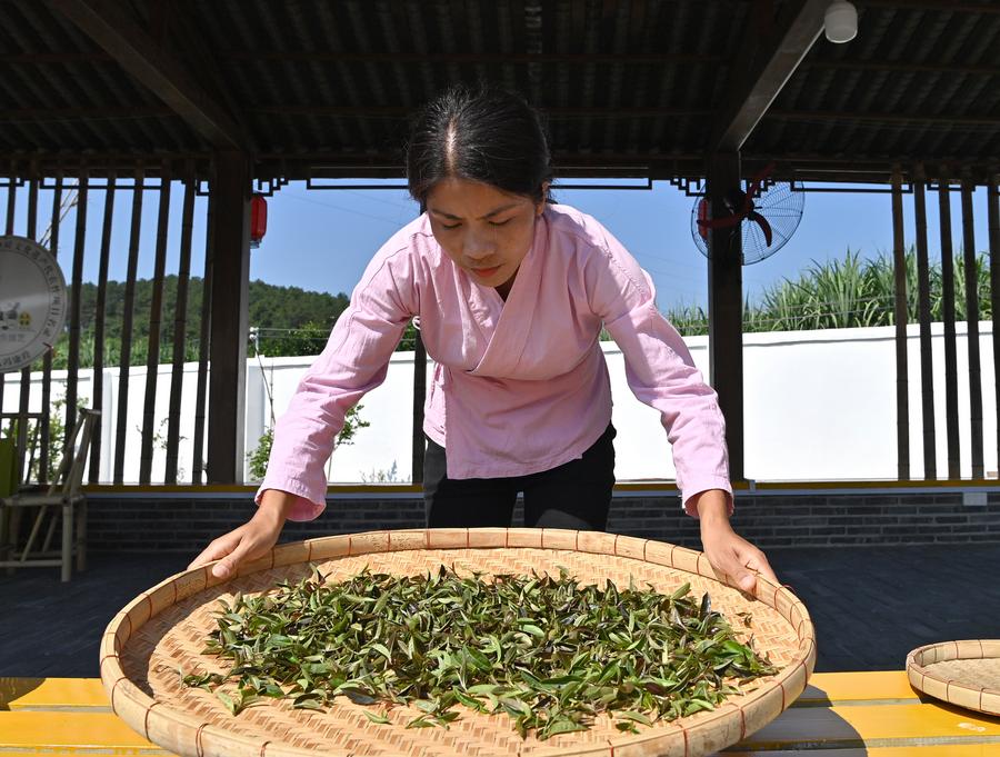Feng Kangchong sun-dries tea leaves in Sigao Village, Miaohuang Township of Xiangzhou County, Laibin City of south China's Guangxi Zhuang Autonomous Region, Oct. 10, 2024. (Xinhua/Zhou Hua)