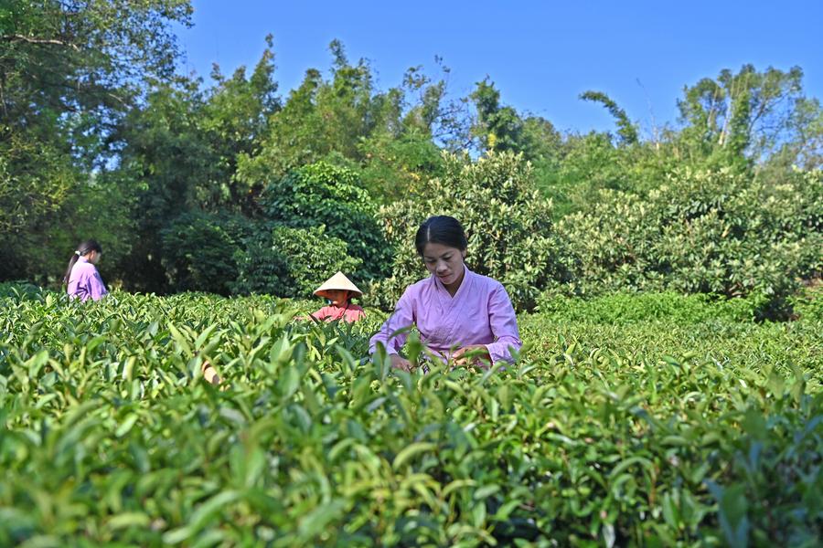 Feng Kangchong picks tea leaves at a tea garden in Sigao Village, Miaohuang Township of Xiangzhou County, Laibin City of south China's Guangxi Zhuang Autonomous Region, Oct. 10, 2024. (Xinhua/Zhou Hua)