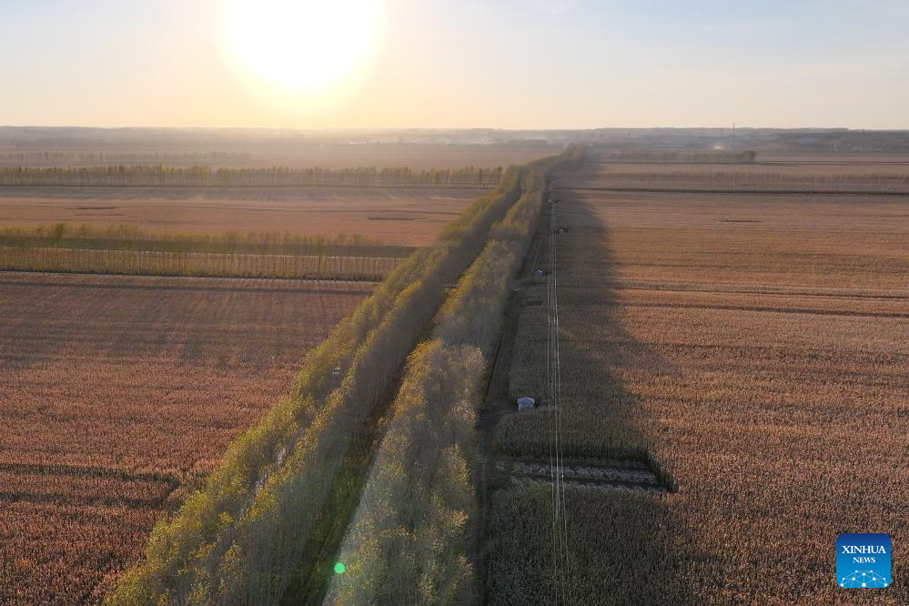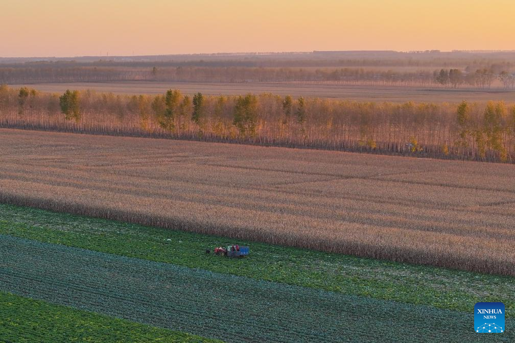 An aerial drone photo taken on Oct. 11, 2024 shows corn fields in sunset in Dongsheng Village, Zhaodong City of northeast China's Heilongjiang Province. (Xinhua/Chen Yichen)
