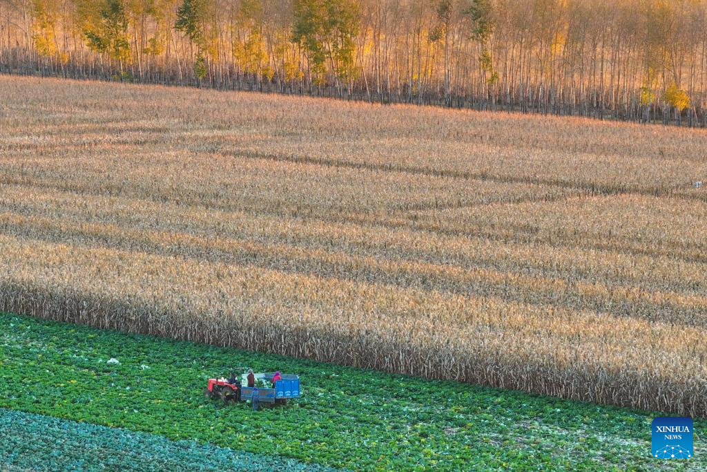 An aerial drone photo taken on Oct. 11, 2024 shows farmers harvesting vegetable in a field in Dongsheng Village, Zhaodong City of northeast China's Heilongjiang Province. (Xinhua/Wang Jianhua)