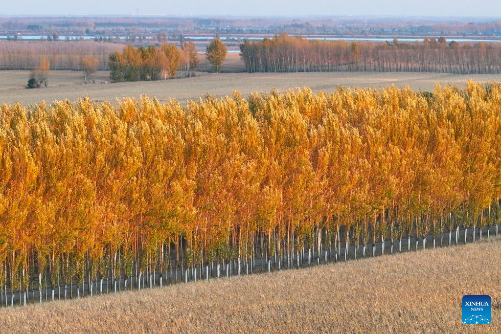 An aerial drone photo taken on Oct. 11, 2024 shows fields and trees in Dongsheng Village, Zhaodong City of northeast China's Heilongjiang Province. (Xinhua/Wang Jianhua)
