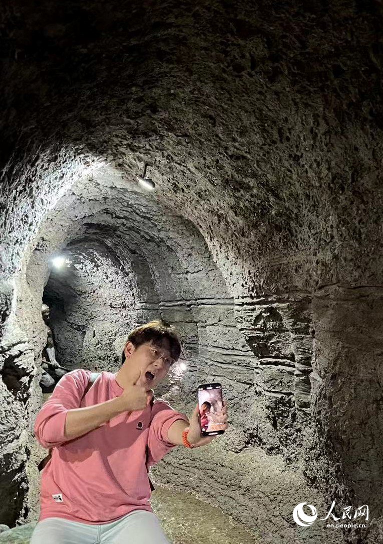 Park Daeil, a South Korean vlogger, takes selfies at a Karez well underground irrigation system in northwest China's Xinjiang Uygur Autonomous Region. (Photo/People's Daily Online)
