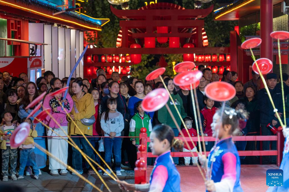 People watch a performance at a tourist attraction in Zhuxi County of Shiyan City, central China's Hubei Province, Oct. 12, 2024. (Xinhua/Wu Zhizun)