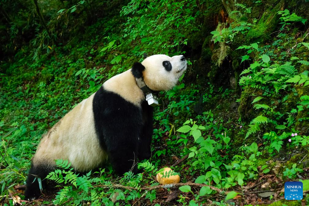 Giant panda Xian Xian is pictured at the second-phase giant panda wild training fields of Tiantai Mountain in Wolong National Nature Reserve in southwest China's Sichuan Province, June 24, 2024. (Xinhua/Shen Bohan)