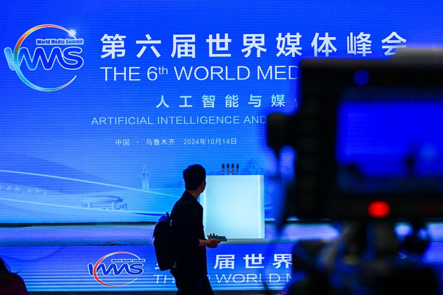 This photo shows a view of the main venue of the sixth World Media Summit at the Xinjiang International Convention and Exhibition Center in Urumqi, northwest China's Xinjiang Uygur Autonomous Region, Oct. 13, 2024. (Xinhua/Ding Lei)