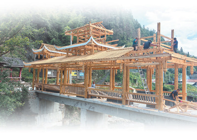 Members of a construction team led by artisan Wu Fangyu build a shelter bridge in Wunong village, Shangzhong township, Liping county, Qiandongnan Miao and Dong Autonomous Prefecture, southwest China's Guizhou Province. (People's Daily/Su Bin)