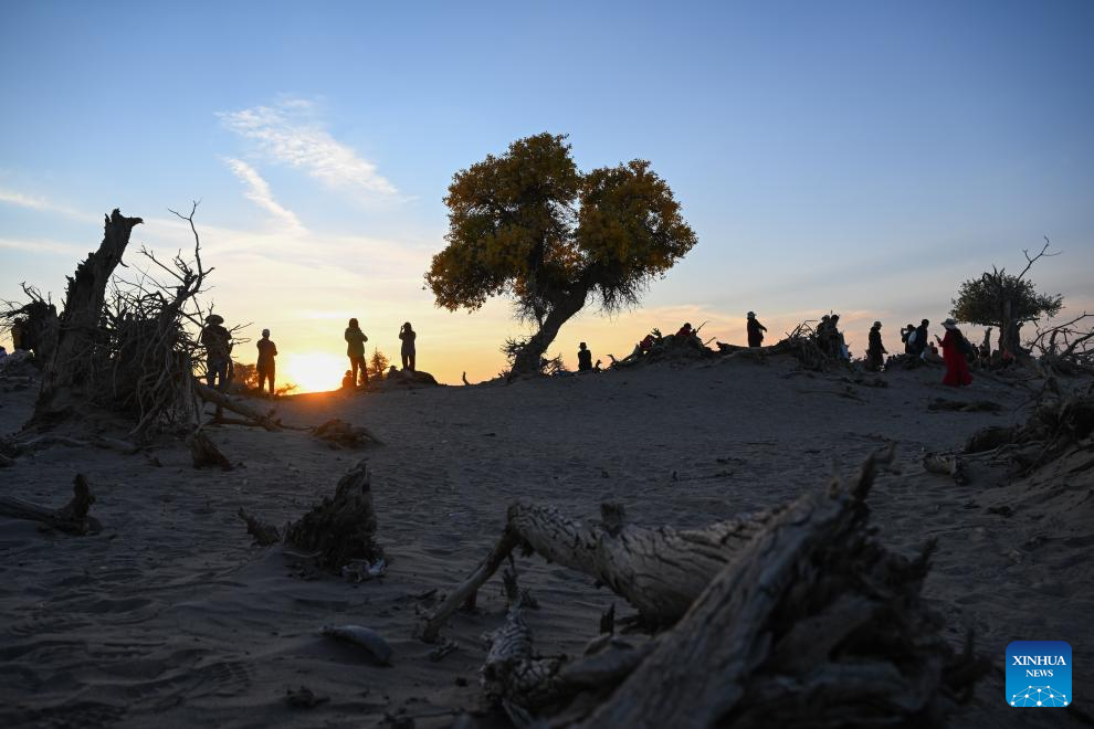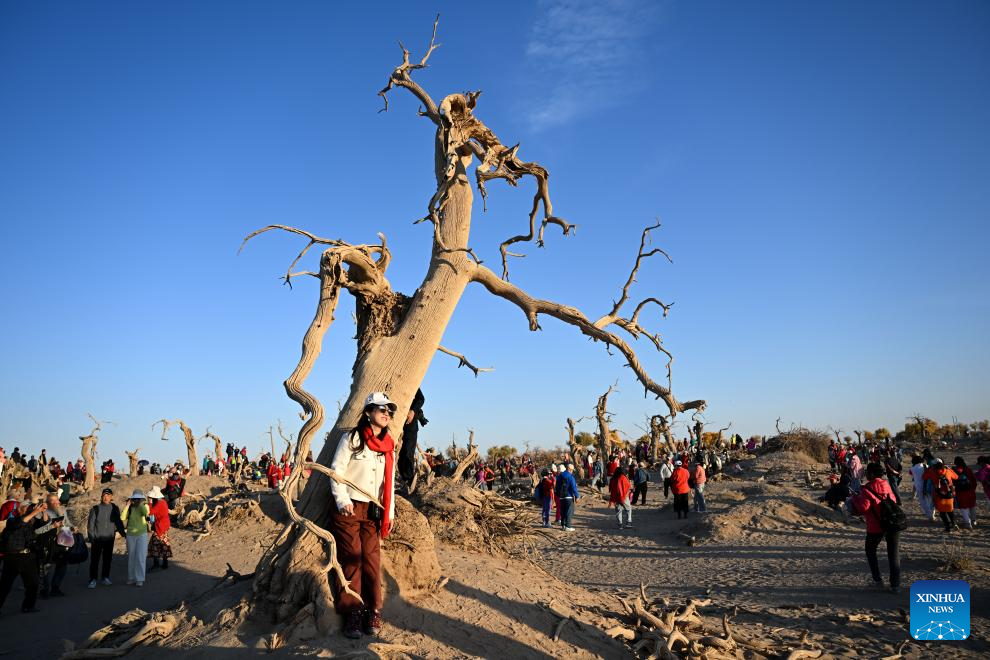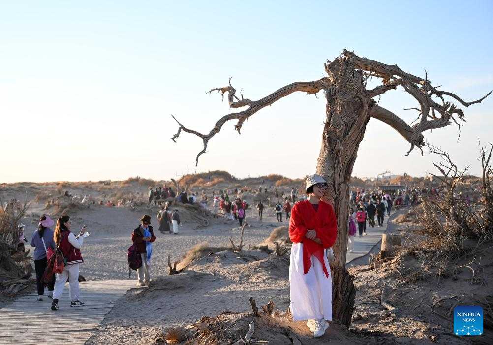Tourists visit the Strange Forest scenic spot in Ejina Banner of Alxa League, north China's Inner Mongolia Autonomous Region, Oct. 14, 2024. (Xinhua/Liu Lianfen)