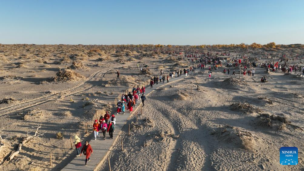 An aerial drone photo shows tourists visiting the Strange Forest scenic spot in Ejina Banner of Alxa League, north China's Inner Mongolia Autonomous Region, Oct. 14, 2024. (Xinhua/Bei He)