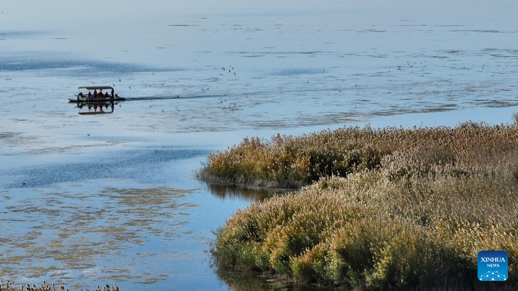 An aerial drone photo shows tourists taking a boat for sightseeing at the Juyanhai scenic spot in Ejina Banner of Alxa League, north China's Inner Mongolia Autonomous Region, Oct. 14, 2024. (Xinhua/Bei He)
