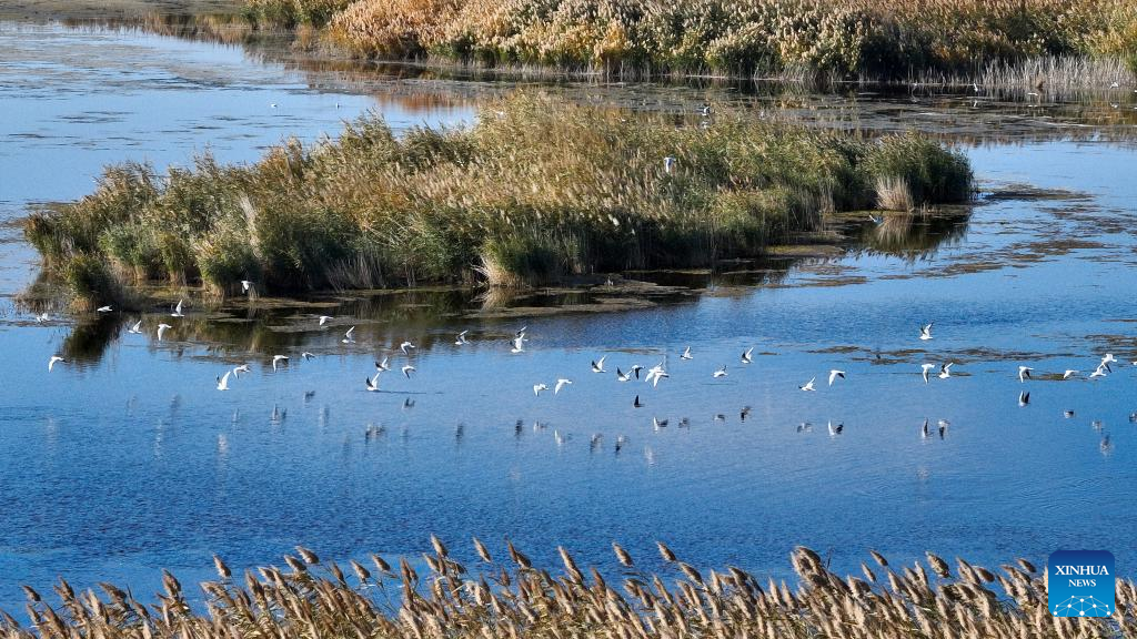 An aerial drone photo shows birds flying over the Juyanhai scenic spot in Ejina Banner of Alxa League, north China's Inner Mongolia Autonomous Region, Oct. 14, 2024. (Xinhua/Bei He)