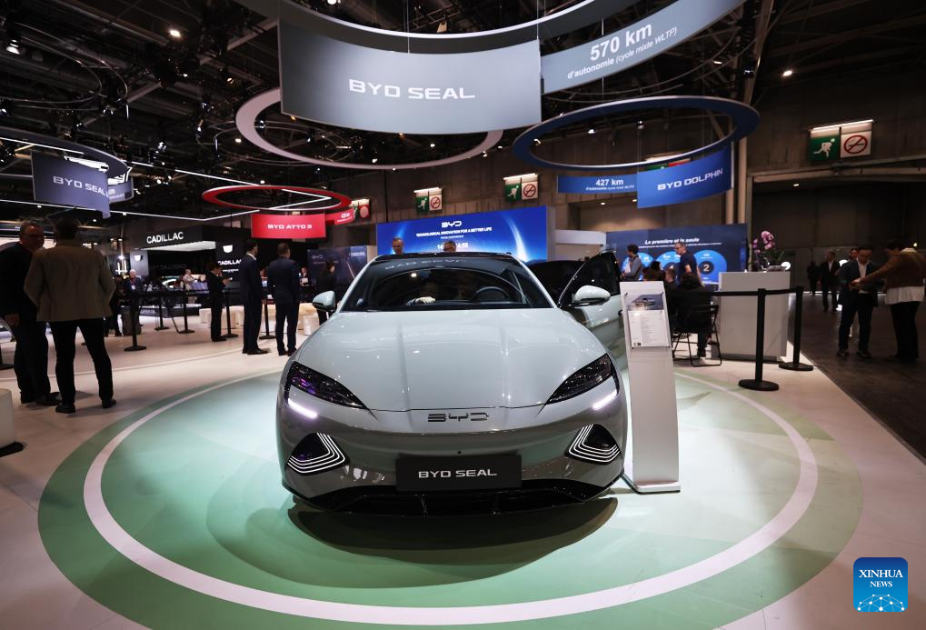 People visit the pavilion of Chinese carmaker BYD at the 2024 Paris Motor Show during the media day in Paris, France, Oct. 14, 2024. (Xinhua/Gao Jing)