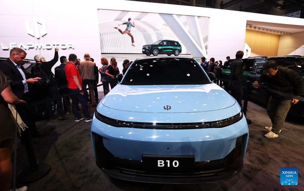 People visit the pavilion of Chinese carmaker Leapmotor at the 2024 Paris Motor Show during the media day in Paris, France, Oct. 14, 2024. (Xinhua/Gao Jing)