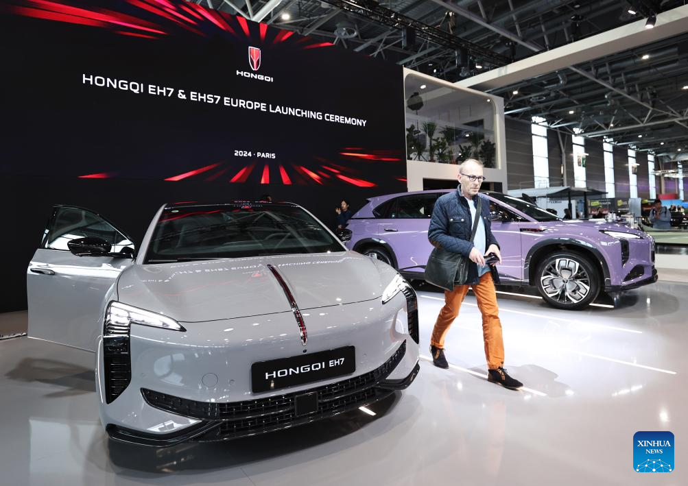 People visit the pavilion of Chinese carmaker FAW-Hongqi at the 2024 Paris Motor Show during the media day in Paris, France, Oct. 14, 2024. (Xinhua/Gao Jing)