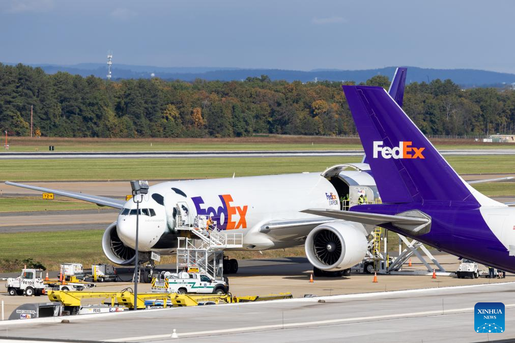 An airplane transporting giant pandas arrives at the Dulles International Airport near Washington, D.C., the United States, on Oct. 15, 2024. A pair of giant pandas, Bao Li and Qing Bao, arrived at Washington, D.C. on Tuesday, after an approximately 19-hour trans-Pacific trip from Sichuan Province in southwest China. A dedicated "FedEx Panda Express" Boeing 777F aircraft landed at the Dulles International Airport near Washington, D.C. at around 10:00 a.m. local time (1400 GMT). (Xinhua/Hu Yousong)