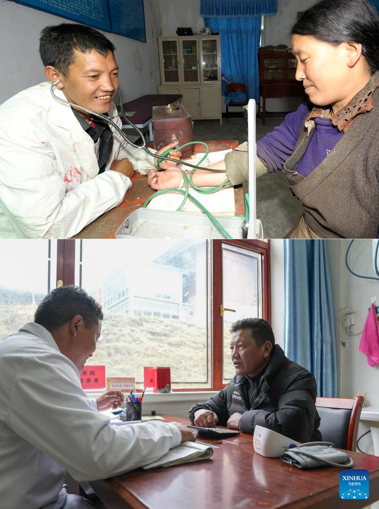 This combo photo shows Zhaxi Norpu (L), a health worker, checking the blood pressure for a resident in Yumai Township of Shannan City, southwest China's Xizang Autonomous Region on Sept. 9, 2009 (above, photo by Xinhua photographer Purbu Zhaxi), and Zhaxi Norpu (R) talking with a doctor in Yumai Township of Shannan City, southwest China's Xizang Autonomous Region on Oct. 15, 2024 (photo by Xinhua photographer Ding Ting). (Xinhua)