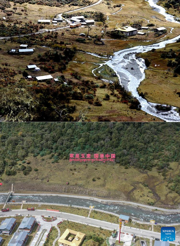 This combo photo shows a view of Yumai Township in Shannan City, southwest China's Xizang Autonomous Region on Oct. 26, 2003 (above, photo by Xinhua photographer Sonam Norbu), and the view here on Oct. 14, 2024 (photo by Xinhua photographer Ding Ting). (Xinhua)?