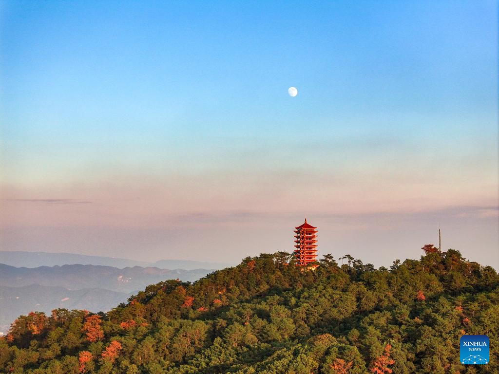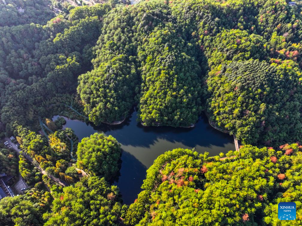 An aerial drone photo taken on Oct. 15, 2024 shows a view of the national nature reserve of Jinyun Mountain in Beibei District, southwest China's Chongqing Municipality.