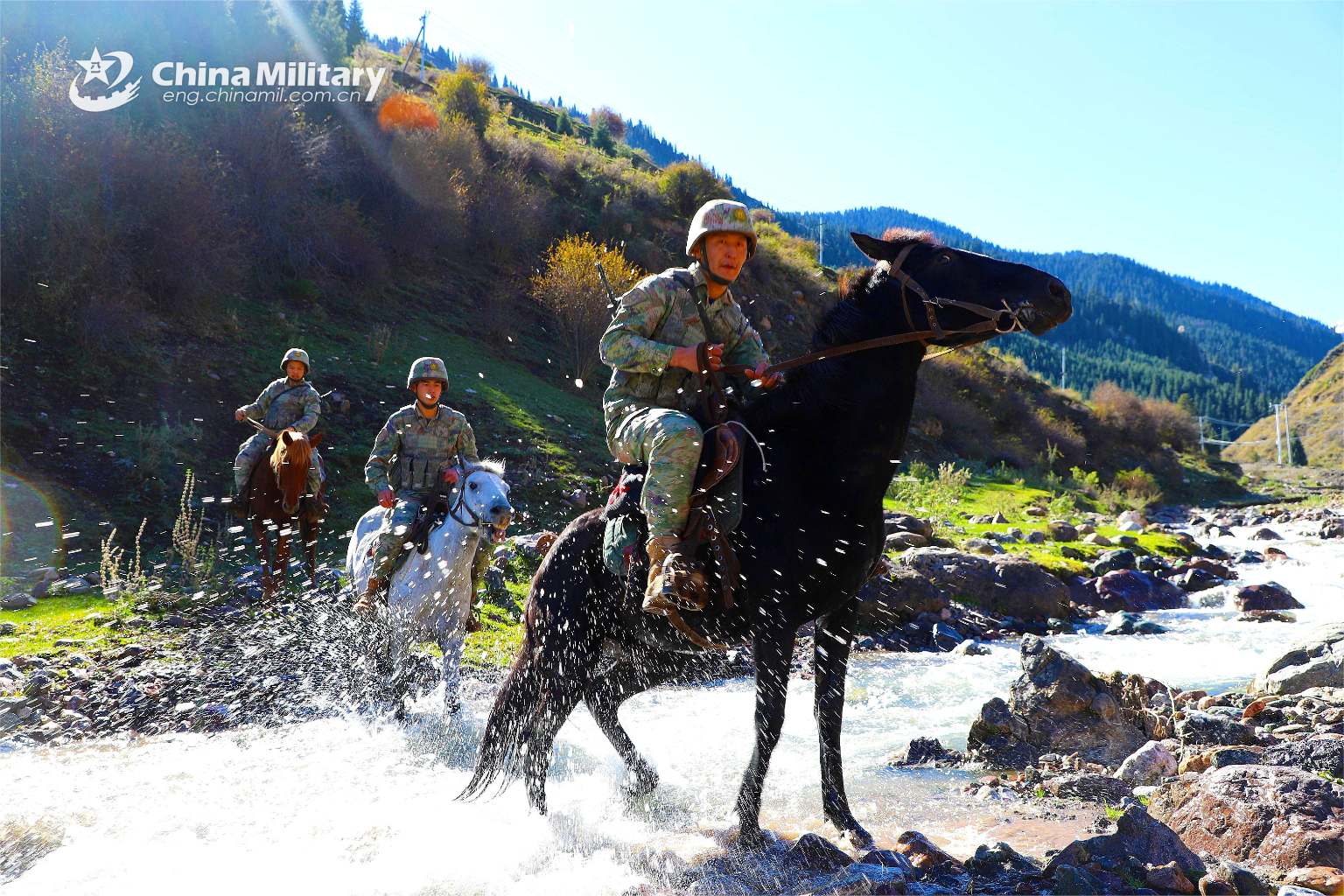 Soldiers assigned to a border defense company of the Ili Military Sub-command under the Chinese PLA Xinjiang Military Command steer their horses to cross a stream during a patrol on September 26, 2024. (eng.chinamil.com.cn/Photo by Jia Zemin)