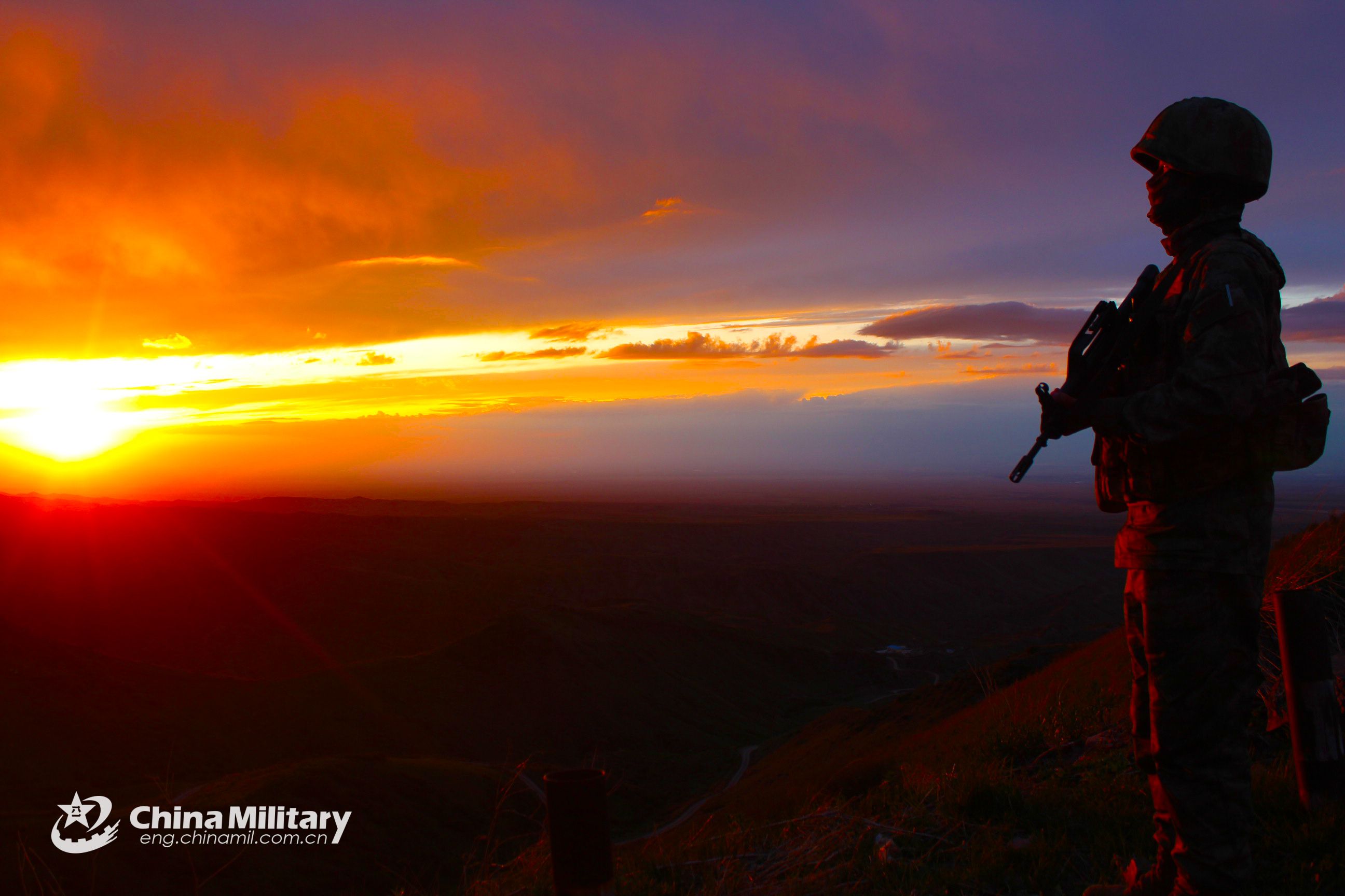 A soldier assigned to a border defense company of the Ili Military Sub-command under the Chinese PLA Xinjiang Military Command stands guard at a lookout post under the sunset on September 29, 2024. (eng.chinamil.com.cn/Photo by Jia Zemin)