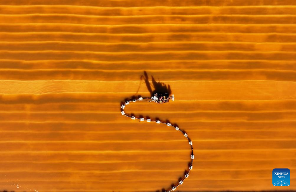 An aerial drone photo taken on Oct. 16, 2024 shows a worker operating a machinery harvesting salt at Nanpu salt field in Caofeidian District of Tangshan, north China's Hebei Province. (Xinhua/Yang Shiyao)