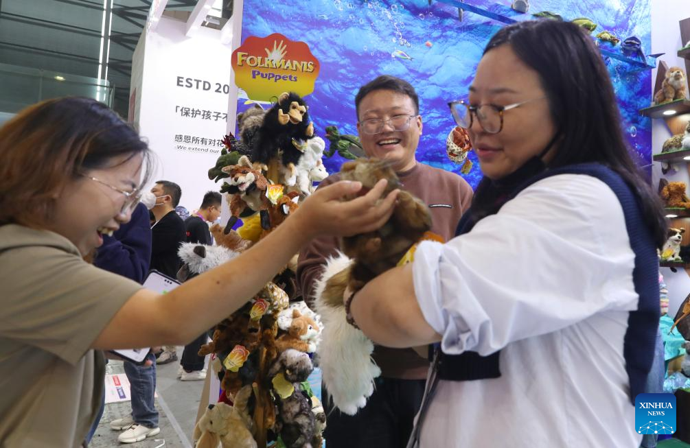A staff member (2nd R) of an exhibitor introduces their products to customers during the 2024 China Toy Expo in east China's Shanghai, Oct. 16, 2024. The three-day 2024 China Toy Expo kicked off at Shanghai New International Expo Centre Wednesday, attracting more than 2,500 companies of the toy industry from home and abroad. (Xinhua/Fang Zhe)