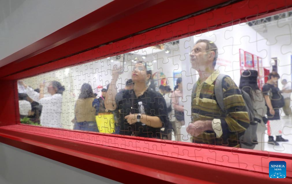 Visitors are seen at the exhibition booth of a jigsaw enterprise during the 2024 China Toy Expo in east China's Shanghai, Oct. 16, 2024. The three-day 2024 China Toy Expo kicked off at Shanghai New International Expo Centre Wednesday, attracting more than 2,500 companies of the toy industry from home and abroad. (Xinhua/Fang Zhe)