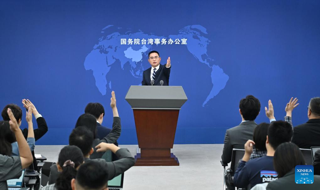 Chen Binhua, a spokesperson for the State Council Taiwan Affairs Office, gestures at a press conference in Beijing, capital of China, Oct. 16, 2024. (Xinhua/Li Xin)
