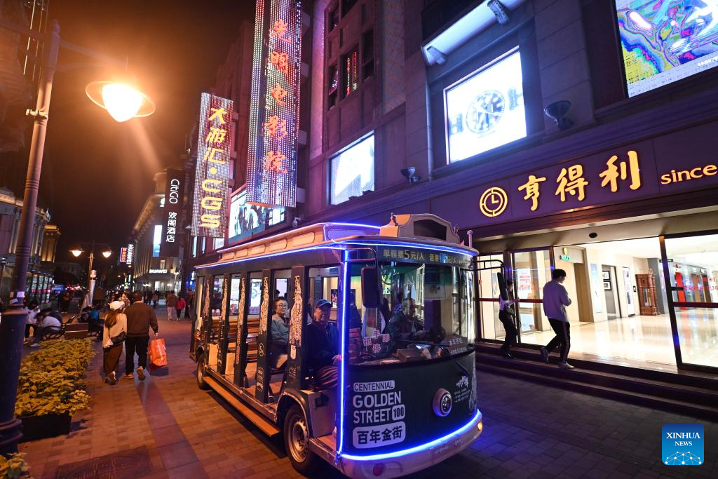 Tourists take a sightseeing tram touring the Golden Street commercial area in north China's Tianjin, Oct. 16, 2024. (Xinhua/Zhao Zishuo)