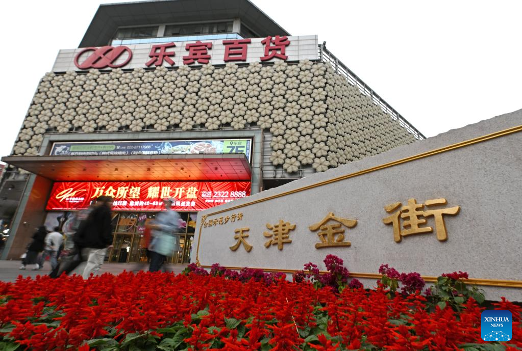 People stroll at a shopping mall in the Golden Street commercial area in north China's Tianjin, Oct. 13, 2024. (Xinhua/Li Ran)