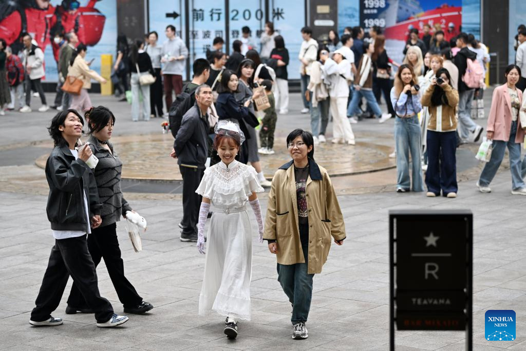 Tourists take a rest in the Golden Street commercial area in north China's Tianjin, Oct. 13, 2024. The Golden Street, a centennial commercial area centering on the crossing of Binjiang Road and Heping Road in Tianjin, is dubbed the cradle of modern business civilization in this municipality. It has gained popularity among citizens and tourists thanks to government-driven renewal and upgrading efforts. (Xinhua/Li Ran)
