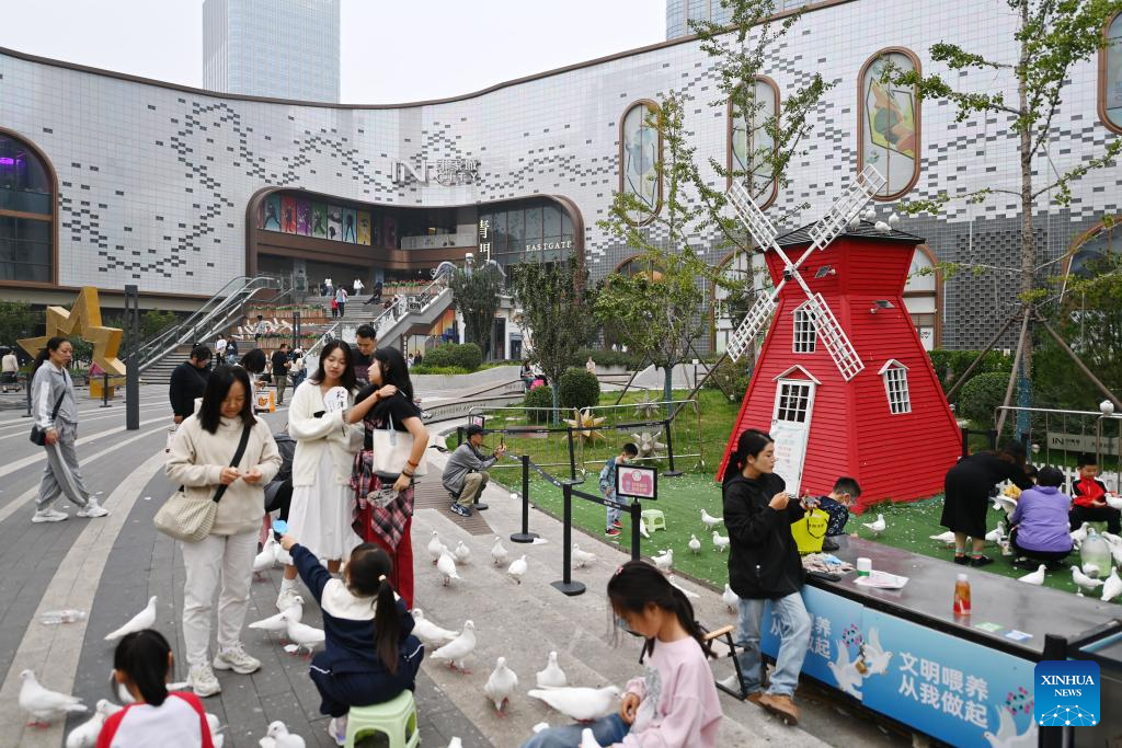 People feed pigeons at a square in the Golden Street commercial area in north China's Tianjin, Oct. 13, 2024. (Xinhua/Li Ran)