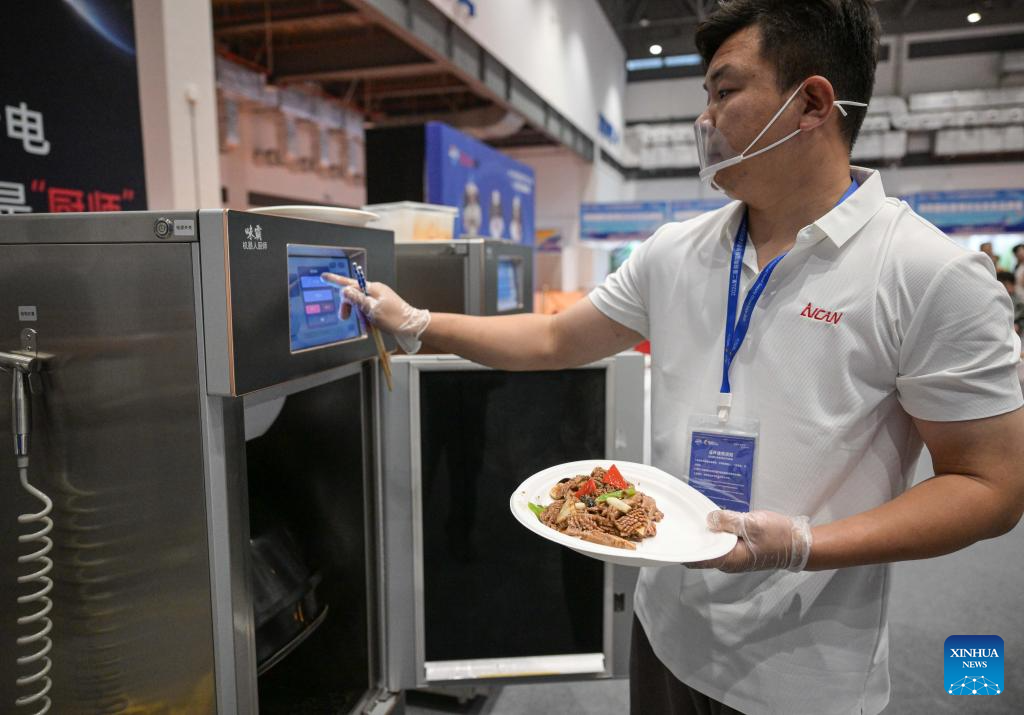 A staff member prepares food by a robot chef during the 2nd Hainan International Tropical Food Supply Chain Expo in Haikou, south China's Hainan Province, Oct. 17, 2024. The 2nd Hainan International Tropical Food Supply Chain Expo kicked off here Thursday. (Xinhua/Pu Xiaoxu)