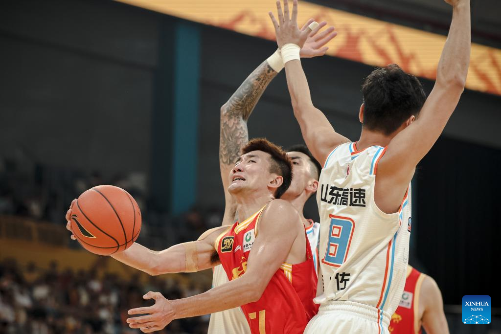 Marquese Chriss (L) of Shandong Heroes goes for a basket during a match between Zhejiang Lions and Shandong Heroes at the 2024-2025 season of the Chinese Basketball Association (CBA) league in Hangzhou, east China's Zhejiang Province, Oct. 17, 2024. (Xinhua/Jiang Han)
