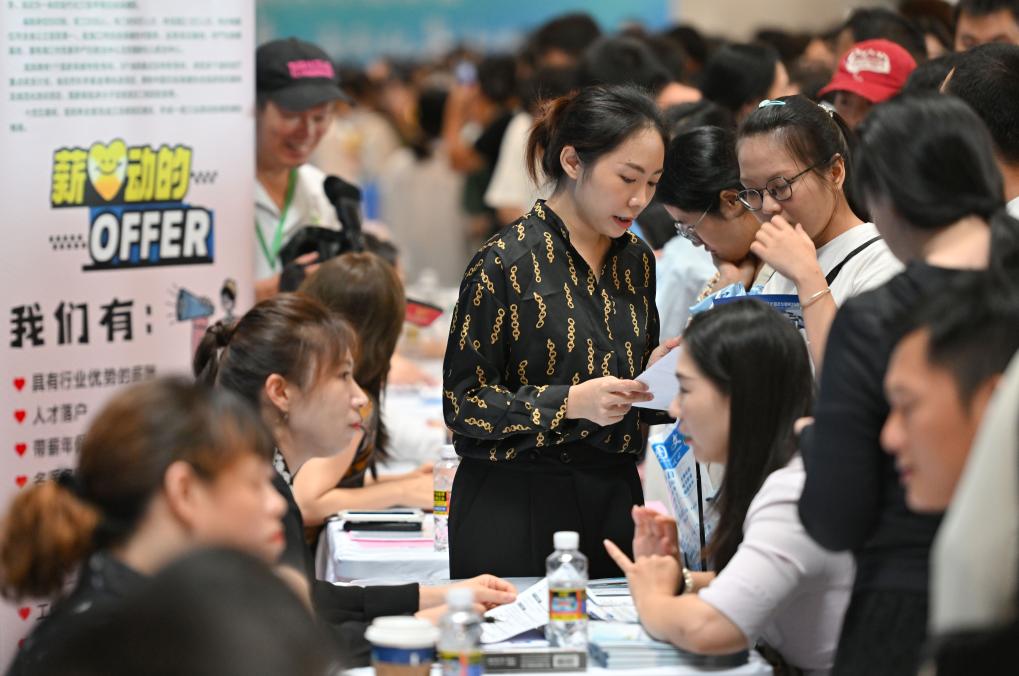 Job seekers talk with recruiting representatives at a job fair in Haikou, capital of south China's Hainan Province, July 20, 2024. (Xinhua/Guo Cheng)