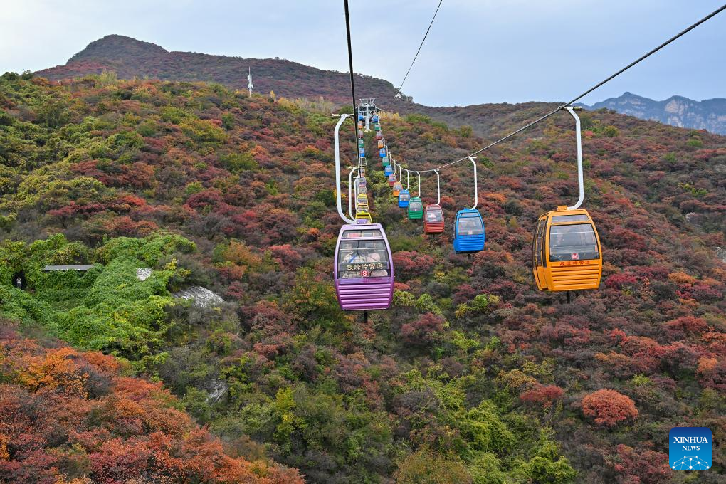 People ride cable cars to enjoy the autumn scenery at Pofengling Scenic Area in Fangshan District of Beijing, Oct. 20, 2024. (Xinhua/Li Xin)