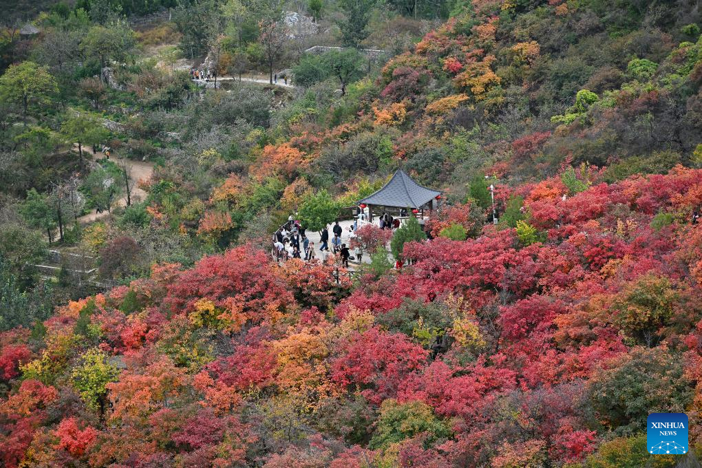 People enjoy the autumn scenery at Pofengling Scenic Area in Fangshan District of Beijing, Oct. 20, 2024. (Xinhua/Li Xin)