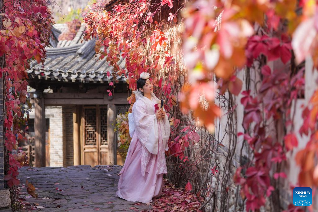 A tourist wearing traditional costume poses for photos in the Gubei Water Town in Beijing, capital of China, Oct. 20, 2024. (Xinhua/Chen Yehua)