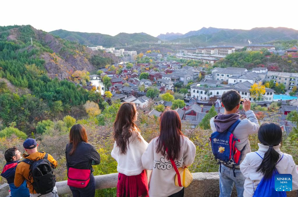 People enjoy the autumn scenery in the Gubei Water Town in Beijing, capital of China, Oct. 20, 2024. (Xinhua/Chen Yehua)