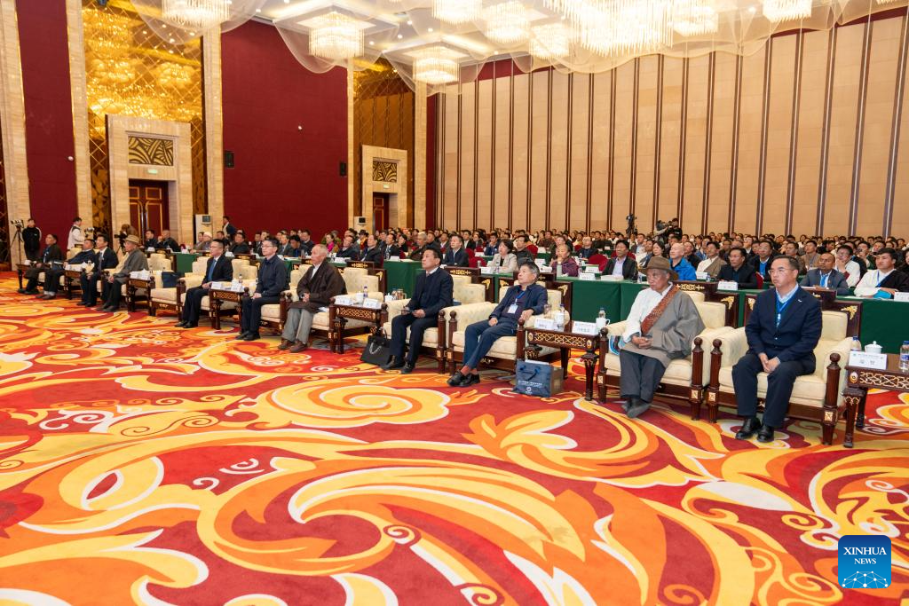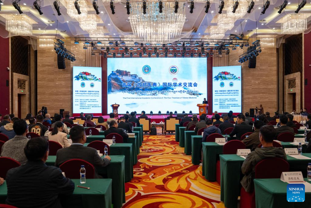 This photo taken on Oct. 18, 2024 shows the first International Academic Conference of the "Four Treatises of Tibetan Medicine" in Lhasa, southwest China's Xizang Autonomous Region. The first International Academic Conference of the "Four Treatises of Tibetan Medicine" kicked off here on Friday, with over 200 guests from both home and overseas attending. Written between the eighth and 12th centuries, the "Four Treatises of Tibetan Medicine" is the most influential foundational work in Tibetan medicine. (Xinhua/Tenzing Nima Qadhup)