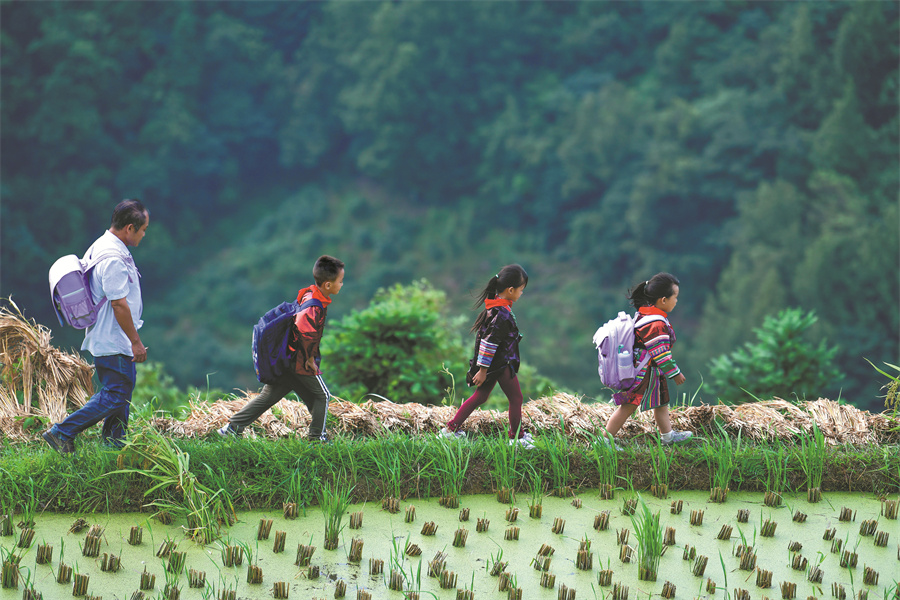 Meng walks three of his students, who live far from the school, home on Sept 5. (YANG WENBIN/XINHUA)