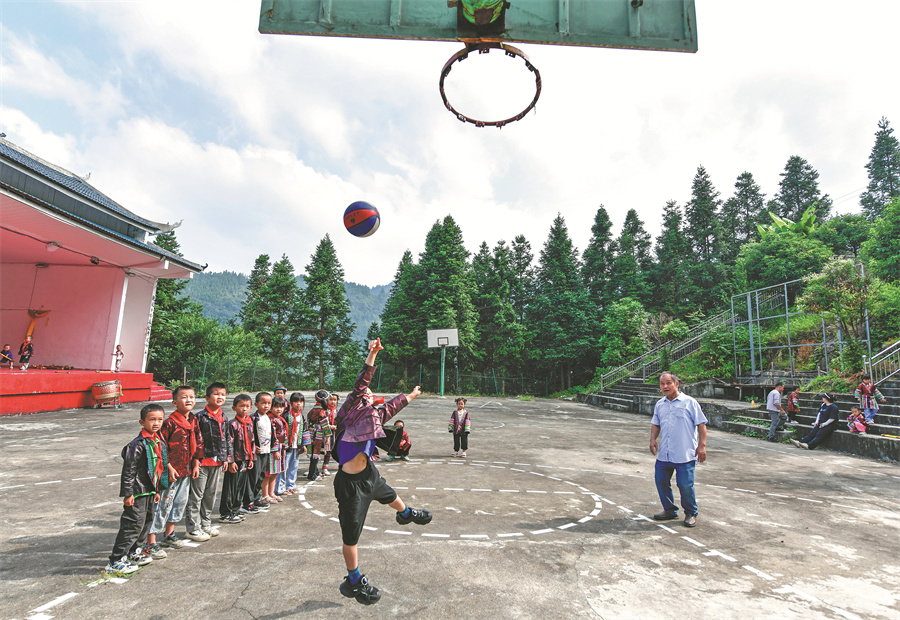 Meng Rongda watches a student playing basketball during a physical education class at Zhongzhai Teaching Point in Xishan town of the Qiandongnan Miao and Dong autonomous prefecture, Guizhou province, on Sept 6. (YANG WENBIN/XINHUA)